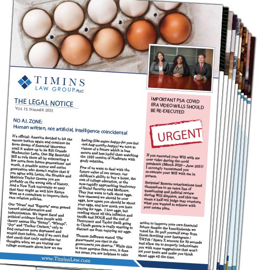 Click on one of the dates below to view The Legal Bulletin. Our semi-annual newsletter from the Timins Law Group.